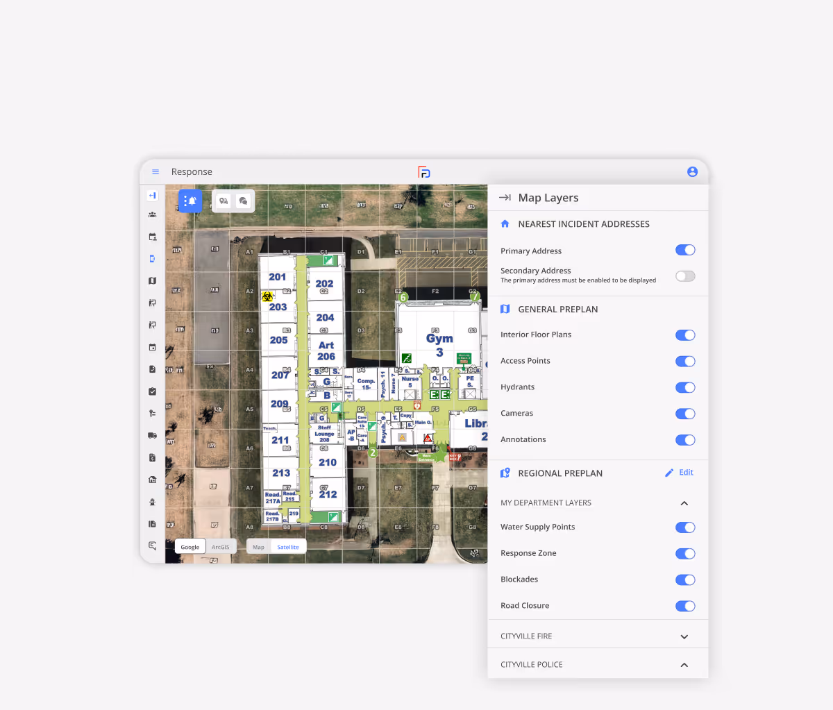 CRG’s Collaborative Response Graphics® (CRGs) are seamlessly integrated within First Due, providing first responders with immediate access to GeoRelevant Integrated Floorplans. These mission-ready maps offer detailed, standardized visuals of building interiors and exteriors, crucial for rapid and informed decision-making during high-risk incidents.
